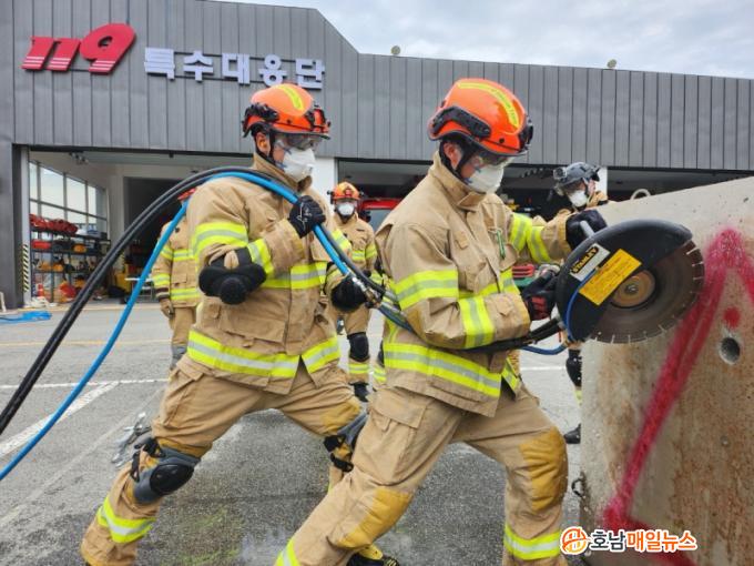 À̳¯ ÈÆ·Ã¿¡¼´Â 119±¸Á¶´ë¿ø 24¸íÀÌ Âü¿©ÇßÀ¸¸ç, À̵éÀº Áß·®¹° ÀÛ¾÷¿ë ¹× Àý´Ü¡¤ÆÄ±«¡¤Å½»ö±¸Á¶¿ë Àåºñ µî µµ½ÃŽ»ö ±¸Á¶Àåºñ 27Á¾ 62Á¡À» Ȱ¿ëÇØ ¡®ºØ±«ÇöÀåÀÇ Àθí Ž»ö°ú ±¸Á¶ ÈÆ·Ã¡¯À» ½Ç½ÃÇß´Ù.