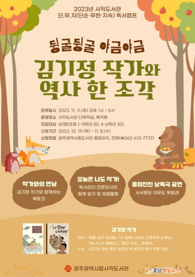 À̳¯ Çà»ç´Â ±è±âÁ¤ ÀÛ°¡ÀÇ ÀÛǰ ¡®°í°¹¸¶·ç µµ±úºñ¡¯, ¡®Çظ¦ »ïŲ ¾ÆÀ̵顯À» ÇÔ²² Àаí ÀúÀÚ¿Í ºÏÅäÅ©, µ¶¼ üÇèȰµ¿, ³¶µ¶±Ø °ü¶÷ µî ´Ùä·Ó°Ô ÁøÇàµÈ´Ù.