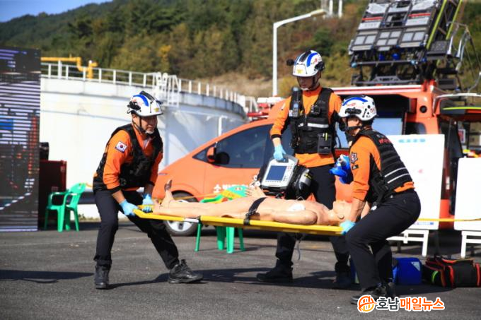 ÈÆ·ÃÀº ½ÇÁ¦ »óȲÀ» ±â¹ÝÀ¸·Î ÇÏ¿© Çѱ¹¼®À¯°ø»ç °î¼ºÁö»çÀÇ À¯·ùÅÊÅ© ¹ëºê ±³Ã¼ÇÏ´Â °úÁ¤¿¡¼ ¹ß»ýµÈ Á¤Àü±â·Î ÀÎÇÑ ÈÀç¿Í ±×·Î ÀÎÇØ ´Ù¼öÀÇ »ç»óÀÚ°¡ ¹ß»ýÇÏ´Â »óȲÀ» °¡Á¤Çß´Ù. ¶ÇÇÑ °ÇÁ¶ÇÑ ³¯¾¾¿Í °ÇÑ ¹Ù¶÷ÀÌ ¿øÀÎÀÌ µÇ¾î ¹ß»ýÇÑ ÈÀç°¡ ÁÖº¯ ¾ß»êÀ¸·Î È®»êµÇ´Â »óȲÀ» °¡Á¤ÇÑ ´ëÇü Àç³ ´ëÀÀ ÈÆ·Ãµµ ÁøÇàµÆ´Ù.