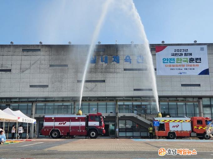 ¿ÃÇØ ÈÆ·ÃÀº ¡®Àü±â»ç°í·Î ÀÎÇÑ ´ÙÁß¹ÐÁý½Ã¼³ ´ëÇüÈÀ硯¶ó´Â °¡»ó »óȲÀ» ¼³Á¤ÇÏ¿© ¿µ±¤±º °Á¾¸¸ ±º¼ö ÁÖÀçÇÏ¿¡ Àç³¾ÈÀü´ëÃ¥º»ºÎ ¿î¿µ¿¡ ´ëÇÑ Åä·ÐÈÆ·Ã°ú ¿µ±¤±º 13°³ Çù¾÷±â´Éº° ½Ç¹«¹Ý°ú ¿µ±¤¼Ò¹æ¼, ¿µ±¤°æÂû¼ µî 9°³ °ü°è±â°ü¡¤´Üü°¡ ÇÔ²² Âü¿©ÇÑ ÇöÀåÈÆ·ÃÀ» µ¿½Ã¿¡ ½Ç½ÃÇÔÀ¸·Î½á ½ÇÁ¦ »óȲ°ú °°Àº ÁöÈÖü°è¸¦ ¿¬ÃâÇß´Ù.