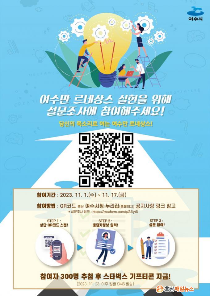 À̹ø ¼³¹®Á¶»ç´Â ¿©¼ö¸¸ ¸£³×»ó½º ¹ßÀü¹æÇâ, 5°³ ¸¸º° Ư¼º ¹× Àü·«°úÁ¦ ¹ß±¼ µî 3°³ ºÎ¹® 25°³ ¹®Ç×À¸·Î ±¸¼ºµÆ´Ù. Âü¿©¸¦ Èñ¸ÁÇÏ´Â ½Ã¹ÎÀº ¿©¼ö½Ãû ´©¸®Áý(www.yeosu.go.kr) ¹è³Ê ¸µÅ© Á¢¼Ó ¶Ç´Â QRÄڵ带 ÅëÇØ ¸ð¹ÙÀϷεµ ½±°Ô Âü¿©ÇÒ ¼ö ÀÖ´Ù.