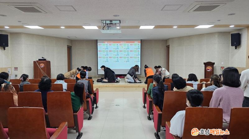 ¾ÈÀü±³À°Àº ÀÀ±Þ»óȲ ¹ß»ý ½Ã ½Å¼ÓÇÏ°Ô ÇÊ¿äÇÑ Á¶Ä¡¸¦ ÇÒ ¼ö ÀÖµµ·Ï ¡ãÀÀ±Þ»óȲ Çൿ ¿ä·É ¡ã¿µÀ¯¾Æ ´ë»ó ½ÉÆó¼Ò»ý¼ú(CPR) ¡ãÀÚµ¿½ÉÀåÃæ°Ý±â(AED) »ç¿ë¹ý ¡ã±âµµ Æó¼â ½Ã ´ëó ¹æ¹ý µî À̷аú Á÷Á¢ üÇèÇØ º¸´Â ½Ç½ÀÀ¸·Î ±¸¼ºµÆÀ¸¸ç, ¾î¸°ÀÌ ÀÌ¿ë½Ã¼³ÀÇ ¾î¸°ÀÌ ´ë¸é ¾÷¹« Á¾»çÀÚ 200¿© ¸íÀÌ ±³À°À» ¼ö·áÇß´Ù.