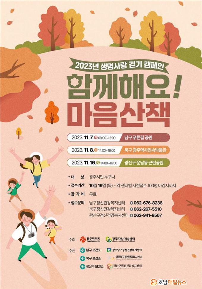 ±¤ÁÖ½Ã, ±¤ÁÖÀڻ쿹¹æ¼¾ÅÍ, 3°³ ÀÚÄ¡±¸(³²±¸, ºÏ±¸, ±¤»ê±¸) Á¤½Å°Ç°º¹Áö¼¾ÅÍ °øµ¿ ÁÖ°üÀ¸·Î ¸¶·ÃµÈ À̹ø Çà»ç´Â ¡®ÇÔ²²ÇØ¿ä! ¸¶À½»êÃ¥!¡¯À» ÁÖÁ¦·Î ¿¸°´Ù. ƯÈ÷ Áö¿ª Áֹεé°ú ÇÔ²² Àڻ쿹¹æ¿¡ ÁÁÀº ¡®°È±â¡¯¸¦ ½ÇõÇÏ¸é¼ Àڻ쿹¹æ¿¡ ´ëÇÑ ÀÎ½Ä °³¼±, ¿¹¹æÀÇ Á߿伺 µîÀ» È«º¸ÇÑ´Ù.