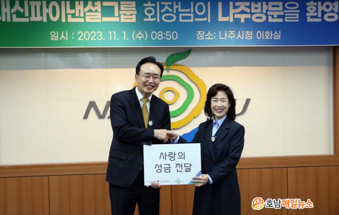 ³ªÁÖ½Ã(½ÃÀå À±º´ÅÂ)´Â Àü³¯ ½Ãû»ç ÀÌȽǿ¡¼ ´ë½ÅÆÄÀ̳½¼È±×·ì°ú »ç¶ûÀÇ ¼º±Ý Àü´Þ½ÄÀ» °¡Á³´Ù°í 2ÀÏ ¹àÇû´Ù. Àü´Þ½Ä¿£ À±º´Å ½ÃÀå°ú ´ë½ÅÆÄÀ̳½¼È±×·ì ÀÌ¾î·æ ȸÀåÀ» ºñ·ÔÇÑ ±×·ì ÀÓ¿øÁø, ½Ãû °£ºÎ°ø¹«¿ø µî 20¿©¸íÀÌ Âü¼®Çß´Ù.