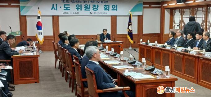 À̳¯ ±è¼ºÁÖ Àü³²¼±°üÀ§¿øÀåÀ» ºñ·ÔÇÑ Àü±¹ 17°³ ½Ã․µµ¼±°üÀ§¿øÀåÀÌ ¸ðµÎ Âü¼®ÇÑ °¡¿îµ¥, ³ëÅÂ¾Ç Áß¾Ó¼±°üÀ§¿øÀåÀº Áö±ÝºÎÅÍ 5°³¿ù¿© ³²Àº Á¦22´ë ±¹È¸ÀÇ¿ø¼±°Å´Â ¼±°Å°ü¸®À§¿øÈ¸°¡ Áö³ÇغÎÅÍ ÃßÁøÇؿ Á¶Á÷ Çõ½Å ¼º°ú¿Í ¼±°Å°ü¸® Àü¹®°¡·Î¼ÀÇ À§»óÀ» ±¹¹Îµé¿¡°Ô º¸ÀÏ ¼ö ÀÖ´Â ±âȸ°¡ µÉ °ÍÀ̶ó¸é¼, À̹ø ±¹È¸ÀÇ¿ø¼±°Å¸¦ °øÁ¤Çϰí Åõ¸íÇÏ°Ô °ü¸®ÇÏ¿© ±¹¹Î ½Å·Ú¸¦ ȸº¹ÇÒ ¼ö ÀÖµµ·Ï °¢ ½Ã․µµ¼±°üÀ§¿øÀåÀ» Æ÷ÇÔÇÑ ¼±°üÀ§ ¸ðµç ±¸¼º¿øµéÀÌ ´ÙÀ½ »çÇ×À» À¯³äÇÏ¿© ¼±°Å¸¦ ÁغñÇØ´Þ¶ó°í ´çºÎÇÏ¿´´Ù.