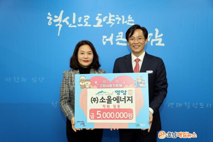 [È£³²¸ÅÀÏ´º½º = ±è±Ý´ö ±âÀÚ] ¿µ¾Ï ½ÃÁ¾¡¤µµÆ÷¸éÀÇ Å¾籤¾÷ü ¢ß¼Ò¿ï¿¡³ÊÁö(´ëÇ¥ ¾ÈÁö¿µ) ÀÓÁ÷¿øµéÀÌ, Áö³ 6ÀÏ ¿µ¾Ï±º¿¡ °íÇâ»ç¶û±âºÎ±Ý 500¸¸ ¿øÀ» ±âŹÇϰí, ´ä·ÊǰÀ¸·Î ¹ÞÀº ¿µ¾Ï»ç¶û»óǰ±Ç 150¸¸ ¿øÀ» º¹Áö½Ã¼³ ¿µ¾Ö¿ø¿¡ ÀüÇß´Ù.