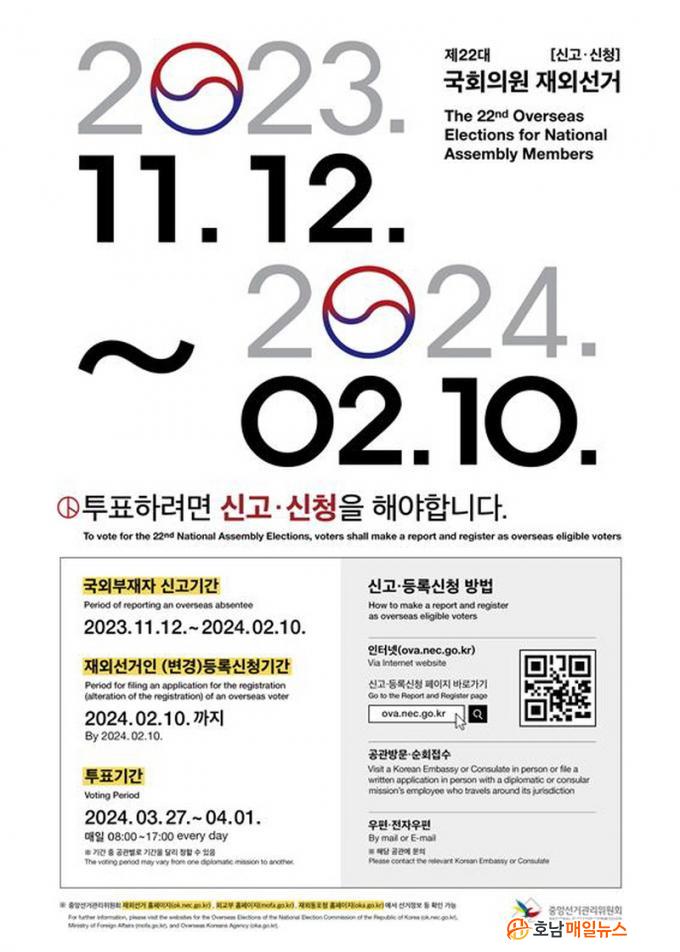 ½Å°í´Â °ø°üÀ» Á÷Á¢ ¹æ¹®Çϰųª ¿ìÆí, ÀüÀÚ¿ìÆí, Áß¾Ó¼±°üÀ§ ÀÎÅÍ³Ý È¨ÆäÀÌÁö¸¦ ÅëÇØ ÇÒ ¼ö ÀÖ´Ù. ÇÑÆí, Àç¿Ü±¹¹Î Áß Áֹεî·ÏÀÌ ¾ø´Â »ç¶÷ÀÌ Àç¿Ü¼±°Å¿¡ Âü¿©Çϱâ À§Çؼ´Â 2024³â 2¿ù 10ÀϱîÁö Àç¿Ü¼±°ÅÀÎ µî·Ï½ÅûÀ» ÇØ¾ß ÇÑ´Ù. ´Ù¸¸, Áö³ ¼±°ÅÀÇ Àç¿Ü¼±°ÅÀθíºÎ¿¡ ¿Ã¶óÀÖ´ø »ç¶÷Àº Á¦22´ë ±¹È¸ÀÇ¿ø¼±°Å Àç¿Ü¼±°ÅÀÎ ¿µ±¸¸íºÎ¿¡ ÀÚµ¿À¸·Î µîÀçµÇ¹Ç·Î º°µµÀÇ ½Åû ¾øÀÌ Àç¿Ü¼±°Å¿¡ Âü¿©ÇÒ ¼ö ÀÖ´Ù.