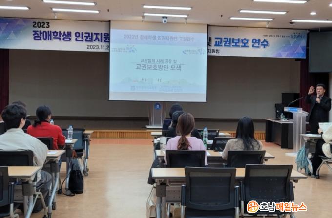 µ¿ºÎ±³À°Áö¿øÃ»¿¡ µû¸£¸é ±¤ÁÖ °ü³» À¯¡¤ÃÊ¡¤ÁßÇб³ ±³»ç Áß Èñ¸ÁÀÚ¸¦ ´ë»óÀ¸·Î ÇÑ À̹ø ¿¬¼ö´Â Àå¾Ö ÇлýÀÇ Æ¯¼ö¼ºÀ¸·Î ÀÎÇØ ±³À°È°µ¿ Ä§ÇØ¿¡ ³ëÃâµÇ±â ½¬¿î ÇöÀå Æ¯¼ö±³»çµéÀÇ °íÃæ°ú ±³±Ç Ä§ÇØ »ç·Ê¸¦ ÆÄ¾ÇÇϰí, °³Á¤µÈ ¡®±³±Çº¸È£ 4¹ý¡¯ µî Á¤Ã¥Àû Áö¿ø ¹æ¾ÈÀ» ¾Ë¾Æº¸´Â ½Ã°£À¸·Î ÁøÇàµÆ´Ù.