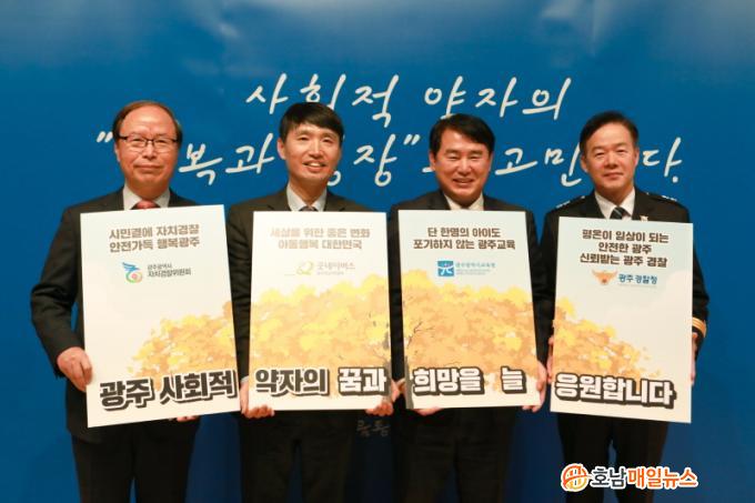 ¡®Áö¿ª ³» »çȸÀû ¾àÀÚÀÇ Çູ°ú ¼ºÀåÀ» °í¹ÎÇÏ´Ù¡¯¸¦ ÁÖÁ¦·Î ¿¸° À̳¯ Çà»ç´Â ÀÌÁ¤¼± ±¤Áֽñ³À°°¨ÀÇ ±âÁ¶°¿¬, ±¤ÁÖ°æÂûû°ú ±Â³×À̹ö½º ±¤ÁÖÀü³²º»ºÎÀÇ °æ°ú ¹× »ç¾÷º¸°í, ÅëÇÕÁö¿ø´Ü Âü¿©±â°ü¡¤´ÜüµéÀÇ Áö¿ø»ç·Ê¸¦ °øÀ¯Çϰí Åä·ÐÇÏ´Â ¼øÀ¸·Î ÁøÇàµÆ´Ù.