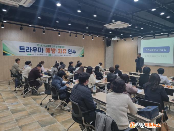 À̳¯ ¿¬¼ö¿¡¼´Â ±èÁ¤ÁÖ ±¤ÁÖÆ®¶ó¿ì¸¶¼¾ÅÍ ÆÀÀåÀÌ ¡â Æ®¶ó¿ì¸¶ÀÇ Á¤ÀÇ ¡â Æ®¶ó¿ì¸¶ Áõ»ó ¡â Æ®¶ó¿ì¸¶ Ä¡À¯, ¾î¶»°Ô ÇÒ °ÍÀΰ¡ µîÀ» ÁÖÁ¦·Î ½Ã¿¬°ú ½Ç½À ±³À°À» ÁøÇàÇß´Ù. ƯÈ÷, Çб³Æø·Â ¹Î¿ø ¹ß»ý °úÁ¤¿¡¼ ¹ß»ýÇÏ´Â »óȲÀ» °¡Á¤ÇÑ Æ®¶ó¿ì¸¶¿¡ ´ëÇØ ½ÅÈ£¸¦ ¾Ë¾ÆÂ÷¸®°í ½ÉÈ£Èí µî È¿°úÀûÀ¸·Î Æ®¶ó¿ì¸¶¸¦ Ä¡À¯ÇÏ´Â ½Ã°£À» °¡Á³´Ù.