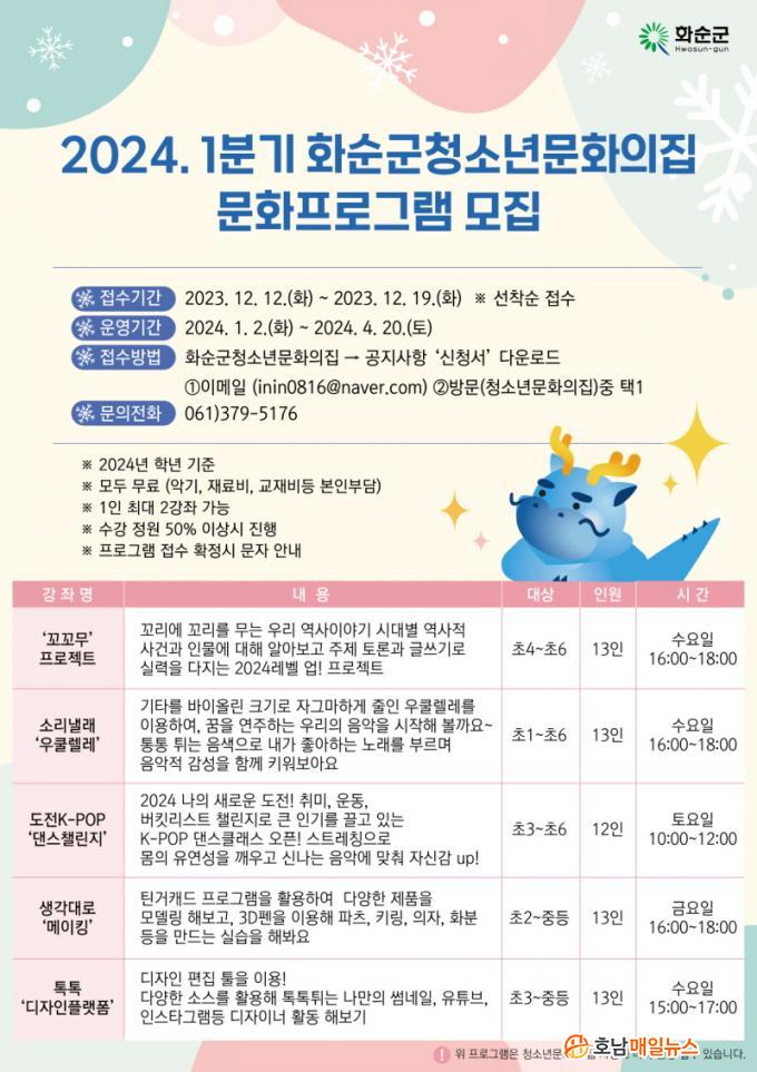 ½ÅûÀº 12¿ù 12ÀÏ(È)~19ÀÏ(È)±îÁö ´ã´çÀÚ À̸ÞÀÏ(inin0816@naver.com)·Î Á¢¼ö Çϰųª û¼Ò³â¹®ÈÀÇ ÁýÀ» ¹æ¹® ÇÏ¸é µÇ°í, Âü°¡ ½Åû¼´Â ȼø±º û¼Ò³â¹®ÈÀÇÁý ȨÆäÀÌÁö(http://hwasunyouth.or.kr)ÀÇ¡´°øÁö»çÇסµ¿¡¼ ³»·Á¹Þ¾Æ¼ ÀÛ¼ºÇÏ¸é µÈ´Ù.
