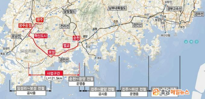 È®Á¤µÈ ³ë¼±Àº ¡®±¤ÁÖ¿ª-±¤ÁÖ¼ÛÁ¤¿ª-³ªÁÖÇõ½Åµµ½Ã¿ª(½Å¼³)-º¸¼º¿ª-¹ú±³¿ª-¼øÃµ¿ªÀ¸·Î ÃÑ ±¸°£ Áß 89.2km´Â ´Ü¼±Àüö·Î ½Å¼³ÇÏ°í ³ª¸ÓÁö 32.3km´Â ±âÁ¸ ¼±À» Ȱ¿ëÇÒ ¹æÄ§ÀÌ´Ù.