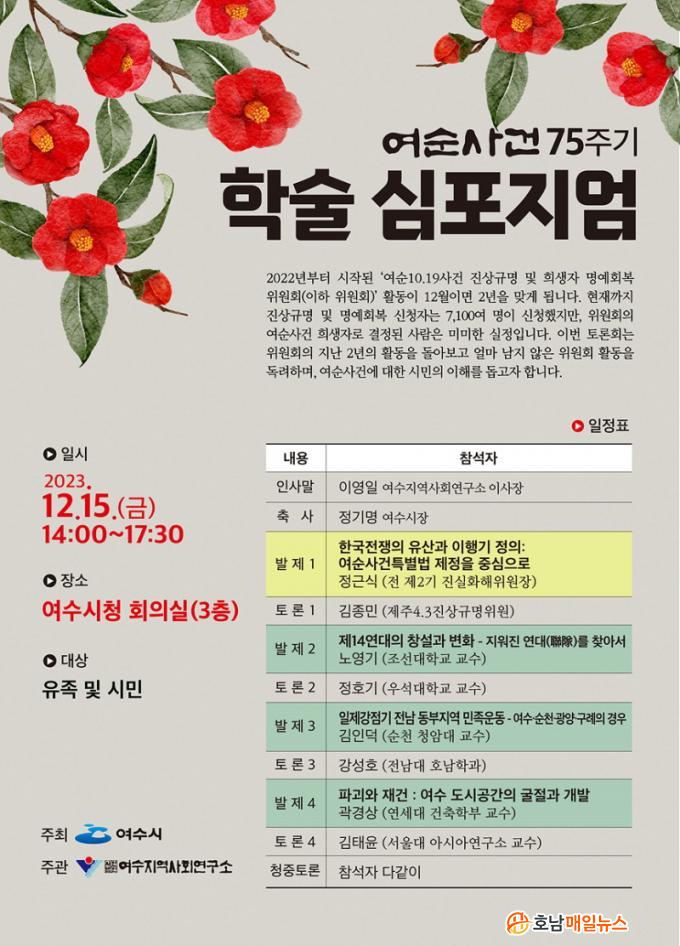 À̹ø Çà»ç´Â ¿©¼ö¡¤¼øÃµ 10¡¤19»ç°Ç Áø»ó±Ô¸í ¹× Èñ»ýÀÚ ¸í¿¹È¸º¹À§¿øÈ¸(ÀÌÇÏ ¿©¼ø»ç°ÇÀ§¿øÈ¸)ÀÇ 2³â°£ÀÇ È°µ¿À» µ¹¾Æº¸°í ÇâÈÄ È°µ¿¹æÇâ¿¡ ´ëÇØ ³íÀÇÇϸç, ¿©¼ø»ç°ÇÀÇ Áø»óÀ» »ìÆìº½À¸·Î½á ¿©¼ø»ç°Ç¿¡ ´ëÇÑ ½Ã¹ÎµéÀÇ ÀÌÇØ¸¦ µ½±â À§ÇØ ¸¶·ÃµÆ´Ù. Çà»ç´Â Á¤±Ù½Ä Àü)Áø½ÇÈÇØ¸¦À§ÇѰú°Å»çÁ¤¸®À§¿øÈ¸ À§¿øÀåÀÇ ¡®Çѱ¹ÀüÀïÀÇ À¯»ê°ú ÀÌÇà±â Á¤ÀÇ: ¿©¼ø»ç°ÇƯº°¹ý Á¦Á¤À» Áß½ÉÀ¸·Î¡¯ ±âÁ¶¹ßÁ¦¿¡ À̾î ÃÑ 4°³ ÁÖÁ¦ ¹ßÇ¥·Î ÁøÇàµÈ´Ù.