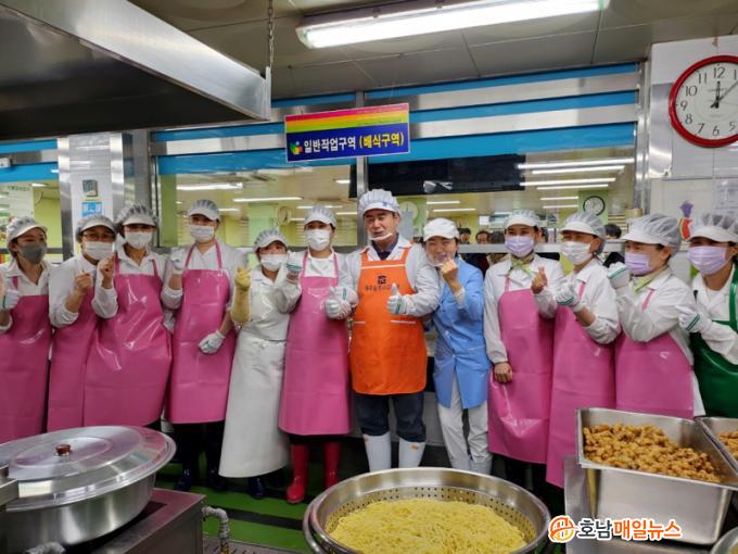 ÀÌ ±³À°°¨Àº À̳¯ À§»ýº¹°ú À§»ý¸ð, À§»ý ¸¶½ºÅ©¸¦ Âø¿ëÇϰí Á¶¸®Á¾»ç¿ø°ú ÇÔ²² Çлýµé¿¡°Ô ÀÏÀÏÀÌ Á¡½ÉÀ» ¹è½ÄÇÏ¸é¼ ¡°Á¡½É ¸ÀÀÖ°Ô ¸Ô¾î¿ä¡±, ¡°Àß ¸Ô¾î¾ß °Ç°Çϰí ÇູÇÕ´Ï´Ù¡±°í ÇлýµéÀ» ÀÀ¿øÇß´Ù.