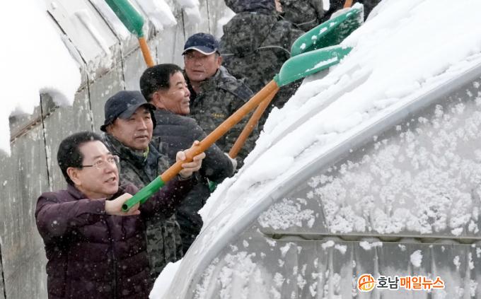 ±è¿µ·Ï Áö»ç´Â ½Ã¼³ÇϿ콺 ÇöÀå¿¡¼ ³óÀÛ¹° ¹× ½Ã¼³ÇϿ콺 ÇÇÇØ°¡ ¹ß»ýÇÏÁö ¾Êµµ·Ï ¡ã³ëÈÄ ºñ´ÒÇϿ콺 ¹× Ãà»ç ÁöºØ¿¡ ½×ÀÎ ´« Ä¡¿ì±â ¡ãÇϿ콺 ÁÖº¯ ¹è¼ö·Î Á¤ºñ ¹× ³»ºÎ º¸¿Â·Â °È ¡ã¹èÃß µî ¿ùµ¿ÀÛ¹° º¸¿Â µî ³ó°¡ Áöµµ¿¡ ÃÑ·ÂÀ» ´ÙÇÒ °ÍÀ» ´çºÎÇß´Ù. ¶ÇÇÑ ÇöÀå¿¡¼ ÇϿ콺 ÁÖº¯ Á¦¼³ÀÛ¾÷ µî ÇÇÇØ ¿¹¹æÀ» À§ÇØ ¾Ö¾²´Â °ø¹«¿ø°ú ÀÚ¿øºÀ»çÀÚ¸¦ °Ý·ÁÇß´Ù.