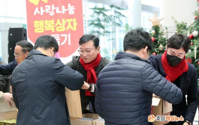 »ç¶û³ª´® Çູ»óÀÚ ¸¸µé±â´Â Àü³²µµ Àü Á÷¿øÀÌ ºÀ±Þ ³¡Àü ÃÑ 1õ¸¸ ¿øÀ» ¸ð¾Æ ¼¤Çª, ºñ´©, ¼ö¼¼¹Ì, Áֹ漼Á¦ µî »ýÇÊǰÀ» ±¸ÀÔÇÏ°í »óÀÚ¿¡ ´ã¾Æ ¾î·Á¿î ÀÌ¿ô¿¡°Ô ³ª´®À» ½ÇõÇÏ´Â Çà»ç´Ù.