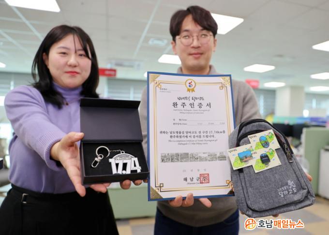´Þ¸¶°íµµ ¿ÏÁÖ ±â³äǰÀº ´Þ¸¶°íµµ 17.74km¸¦ ¿ÏÁÖÇÑ ¿©Çà°´µé¿¡°Ô ÁÖ¾îÁø´Ù. ¿ÏÁÖ ÀÎÁõ¼¿Í ¸Þ´Þ, ¹èÁö 3Á¾ ¼¼Æ®·Î ±¸¼ºÇß´Ù. ¸Þ´ÞÀº ´Þ¸¶°íµµ µÑ·¹±æÀÇ ÃÑ ±æÀÌÀΡ®17.74§°¡¯¸¦ Çü»óÈÇßÀ¸¸ç, ¹èÁö´Â ´Þ¸¶°íµµÀÇ ÄÚ½ºº° Ư¡ÀÌ ´ã±ä 3°¡Áö ¸ð¾çÀ¸·Î Á¦À۵ƴÙ.