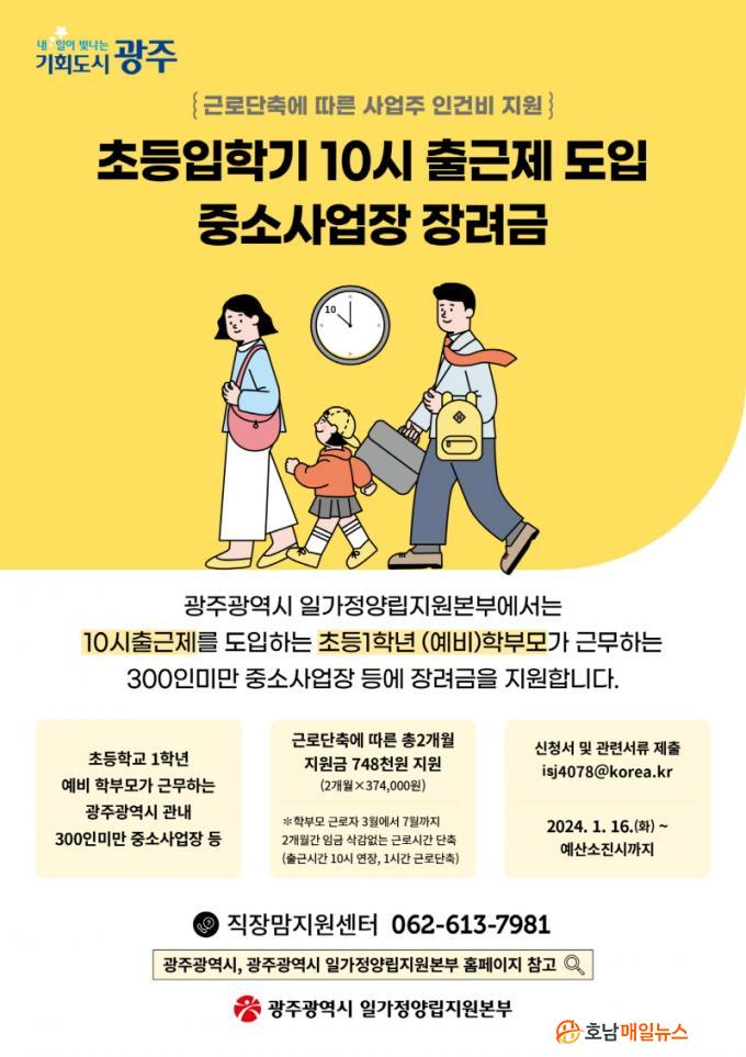 ±¤Áֽà Àϰ¡Á¤ ¾ç¸³ Áö¿øÁ¤Ã¥ÀÎ ¡®Ãʵî1Çгâ Çкθð 10½Ã Ãâ±ÙÁ¦ µµÀÔ Áß¼Ò»ç¾÷Àå Àå·Á±Ý Áö¿ø »ç¾÷¡¯Àº 300ÀÎ ¹Ì¸¸ Áß¼Ò»ç¾÷Àå¿¡¼ ±Ù¹«ÇÏ´Â Ãʵî 1Çгâ Çкθð ±Ù·ÎÀÚ°¡ ÀÔÇбâ(3~7¿ù)¿¡ ÃÖ´ë 2°³¿ù°£ Ãâ±Ù½Ã°£À» 1½Ã°£ ´ÊÃâ ¼ö ÀÖµµ·Ï Áö¿øÇÏ´Â »ç¾÷ÀÌ´Ù.