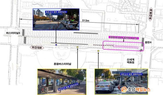 ´õºÒ¾î ±¤Ãµ»ç°Å¸®¿¡¼ µ¿¿î°í°¡ ¹æ¸é ÁÂȸÀü ±ÝÁö Á¤º¸ Àü´ÞÀÌ ¹ÌÈíÇÏ´Ù´Â ÁöÀû¿¡ µû¶ó ¿îÀüÀÚ¿Í Åýà ½Â°´ µîÀÇ ´«¿¡ Àß ¶ç´Â °÷¿¡ ¡®µ¿¿î°í°¡ ¹æ¸é ÁÂȸÀü ±ÝÁö¡¯¶ó´Â ´ëÇü ¾È³»Ç¥ÁöÆÇÀ» Ãß°¡ ¼³Ä¡ÇØ ¾È³»Ã¼°è¸¦ °ÈÇß´Ù.