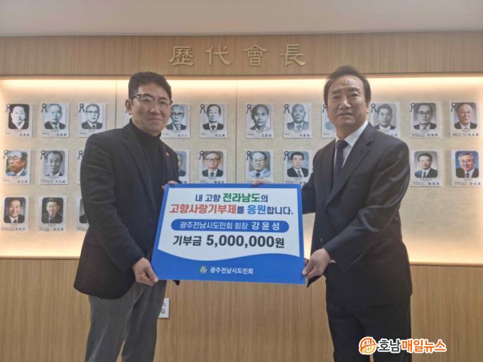 °À±¼º ±¤ÁÖÀü³²½Ãµµ¹Îȸ ȸÀåÀº Áö³ÇØ Àü³²µµ¿Í °Áø±º¿¡ °¢ 250¸¸ ¿ø¾¿ ±âºÎÇÑ µ¥ À̾î 10ÀÏ 500¸¸ ¿øÀÇ °íÇâ»ç¶û±âºÎ±ÝÀ» Àü³²µµ¿¡ ±âŹ, 2024³â Àü³² °íÇâ»ç¶û±âºÎ±Ý °í¾× ±âºÎ Á¦1È£·Î °íÇâÀ» »ç¶ûÇÏ´Â ¸¶À½À» ÀüÇß´Ù.