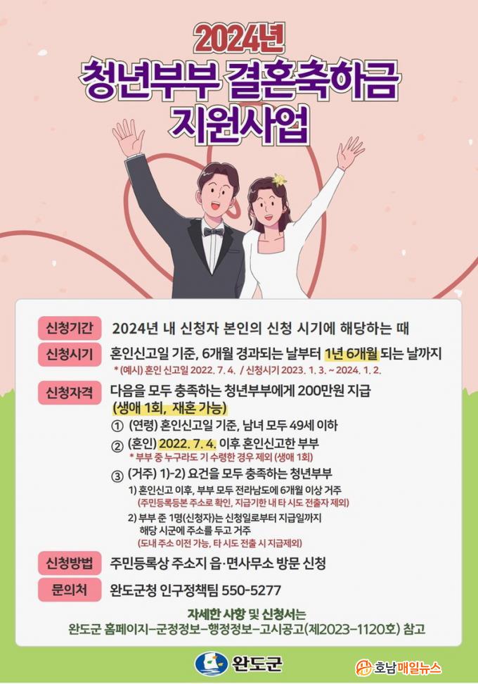 °ÅÁÖ ¿ä°ÇÀº ¡ãÈ¥ÀνŰí ÀÌÈÄ, ºÎºÎ ¸ðµÎ Àü¶ó³²µµ 6°³¿ù ÀÌ»ó °ÅÁÖ(Áö±Þ ±âÇÑ ³» Ÿ ½Ãµµ ÀüÃâÀÚ Á¦¿Ü) ¡ãºÎºÎ Áß 1¸í ÀÌ»óÀº ¿Ïµµ±º¿¡ ÁÖ¼Ò¸¦ µÐ û³â ºÎºÎÀÌ´Ù. ¿ÃÇØ´Â ¿¬°£ ÃÑ 100½ÖÀÇ ºÎºÎ¸¦ Áö¿øÇϸç, ÃàÇϱÝÀº ½ÅûÇÑ ´ÞÀÇ ´ÙÀ½ ´Þ 10ÀÏ¿¡ Áö±ÞÇÑ´Ù.