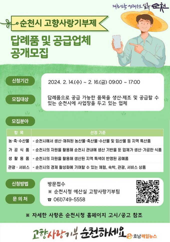 °ø°³¸ðÁý ³»¿ëÀº ¿À´Â 31ÀϺÎÅÍ 2¿ù 16ÀϱîÁö ½Ã ȨÆäÀÌÁö¸¦ ÅëÇØ °ø°íµÇ¸ç, ½Åû ±â°£Àº 2¿ù 14ÀϺÎÅÍ 16ÀϱîÁöÀÌ´Ù. ´ä·ÊǰÀ» Á¦¾ÈÇÏ°í °ø±ÞÀ» ¿øÇÏ´Â ¾÷ü´Â ¼øÃµ½Ãû ¿¹»ê½Ç °íÇâ»ç¶û±âºÎÆÀÀ¸·Î ¹æ¹®ÇØ ½Åû ¼·ù¸¦ Á¦ÃâÇÏ¸é µÈ´Ù.