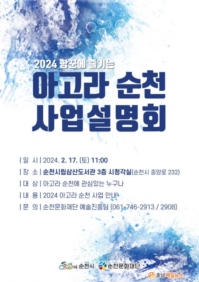 À̹ø ¼³¸íȸ´Â ¾Æ°í¶ó ¼øÃµ¿¡ °ü½É ÀÖ´Â ¹®È¿¹¼úÀÎÀ̶ó¸é ´©±¸³ª º°µµ ½Åû ¾øÀÌ Âü¼® °¡´ÉÇϸç, ÀÚ¼¼ÇÑ ³»¿ëÀº ¼øÃµ¹®ÈÀç´Ü ¿¹¼úÁøÈïÆÀ(¢Ï061-746-2913, 2908)À¸·Î ¹®ÀÇÇÏ¸é µÈ´Ù.