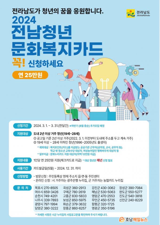 Áö¿ø ´ë»óÀº 2022³â 3¿ù 1ÀÏ ÀÌÀüºÎÅÍ Àü¶ó³²µµ¿¡ ÁÖ¼Ò¸¦ µÎ°í °è¼Ó °ÅÁÖÇϰí ÀÖ´Â 19¼¼ ÀÌ»ó 28¼¼ ÀÌÇÏ(1996~2005³â Ãâ»ý) û³âÀ̸ç 1ÀÎ´ç ¿¬ 25¸¸ ¿øÀÇ ¹®Èº¹Áöºñ¸¦ Áö¿øÇÑ´Ù. ´Ù¸¸ ¡ãº¹ÁöÆ÷ÀÎÆ®(Ä«µå)¸¦ Áö±Þ¹Þ´Â °ø°ø±â°üÀÇ ±Ù¹«ÀÚ ¡ãÇб³ ¹Û û¼Ò³â ±³À° ¼ö´ç Áö±Þ ´ë»óÀÚ ¡ãÀü¶ó³²µµ ¿©¼º³ó¾÷ÀÎ ¹Ù¿ìó ´ë»óÀÚ´Â À̹ø »ç¾÷¿¡¼ Á¦¿ÜµÇ°í ¡ã¹®È´©¸®Ä«µå Áö¿ø ´ë»óÀÚ¿¡°Ô´Â ¹®È´©¸®ºñ¸¦ Á¦¿ÜÇÑ Â÷¾× 12¸¸ ¿øÀÌ Áö±ÞµÈ´Ù.