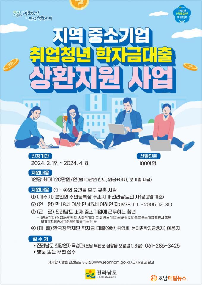 Áö¿øÀ» ¹Ù¶ó´Â û³âÀº 4¿ù 8ÀϱîÁö Àü³²µµ Èñ¸ÁÀÎÀçÀ°¼º°ú¿¡ ¹æ¹®Çϰųª ¿ìÆí(Àü³²µµ ¹«¾È±º »ïÇâÀ¾ ¿À·æ±æ 1, Àü¶ó³²µµÃ» Èñ¸ÁÀÎÀçÀ°¼º°ú)À¸·Î Á¢¼öÇÏ¸é µÈ´Ù. ¼·ù½É»ç¸¦ °ÅÃÄ 4¿ù²² Áö¿ø ´ë»óÀÚ 100¿© ¸íÀ» ¼±Á¤ÇÒ °èȹÀÌ´Ù. Áö¿ø ´ë»óÀÚ·Î ¼±Á¤µÈ û³âÀº ¼±»óȯ ÈÄÁö¿ø ¹æ½ÄÀ¸·Î ºÐ±â¸¶´Ù °³Àκ° ÇÐÀÚ±Ý ´ëÃâ »óȯ ³»¿ªÀ» È®ÀÎÇÑ ÈÄ ¿ù ÃÖ´ë 10¸¸ ¿ø, ¿¬ ÃÖ´ë 120¸¸ ¿øÀ» Áö¿ø¹ÞÀ» ¼ö ÀÖ´Ù.