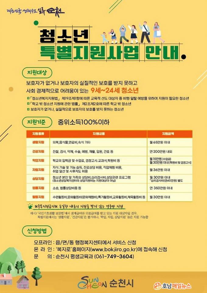 Áö¿ø ³»¿ëÀº »ýȰ¡¤°Ç°¡¤Çо÷¡¤ÀÚ¸³¡¤»ó´ã¡¤¹ý·ü¡¤È°µ¿ Áö¿ø µîÀ̸ç, Áö¿ø ±âÁØÀº °¡±¸ÀÇ ÁßÀ§¼Òµæ 100% ÀÌÇÏÀΠû¼Ò³âÀÌ´Ù. ½Åû ¹æ¹ýÀº ÁÖ¼ÒÁö °üÇÒ À¾¡¤¸é¡¤µ¿ ÇàÁ¤º¹Áö¼¾ÅÍ ¹æ¹® ¶Ç´Â ¡®º¹Áö·Î¡¯ ´©¸®Áý¿¡¼ ½ÅûÇÒ ¼ö ÀÖÀ¸¸ç, ±âŸ ¹®ÀÇ»çÇ×Àº ¼øÃµ½Ã Æò»ý±³À°°ú(061-749-3604)¸¦ ÅëÇØ ¾È³»¹ÞÀ» ¼ö ÀÖ´Ù.