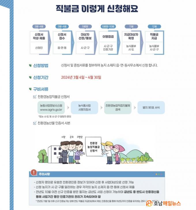 Áö±Þ ´ë»óÀº »ç¾÷ ±â°£(2023³â 11~2024³â 10¿ù) ģȯ°æÀÎÁõÀ» À¯ÁöÇϰí 5¿ù¿¡¼ 10¿ù±îÁö ģȯ°æ³ó¾÷ ½Çõ Áؼö»çÇ× ÀÌÇà ¿©ºÎ¸¦ ÀÎÁõ±â°üÀÌ Á¡°ËÇØ ÀûÇÕÀ¸·Î Å뺸¹ÞÀº °æ¿ì´Ù. 12¿ù¿¡ Á÷ºÒ±ÝÀ» Áö±ÞÇÒ °èȹÀÌ´Ù.´Ù¸¸ »ç¾÷ ±â°£ ³» ģȯ°æÀÎÁõ ±â°£ÀÌ ¸¸·á ¿¹Á¤ÀÎ ³ó¾÷ÀÎÀº ÀÎÁõÀÌ ¸¸·áµÇ±â 2°³¿ù Àü¿¡ °»½Å ½ÅûÀ» ÇØ¾ß Çϰí, °»½ÅµÇÁö ¾ÊÀ¸¸é Á÷ºÒ±ÝÀÌ Áö±ÞµÇÁö ¾Ê´Â´Ù.