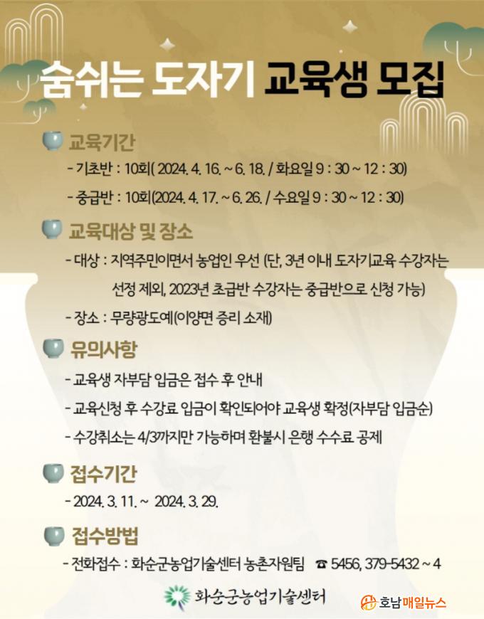 À̹ø ±³À°Àº À̾ç¸é ¡®¹«·®±¤µµ¿¹°ø¹æ¡¯¿¡¼ 4¿ù 16ÀϺÎÅÍ 6¿ù 26±îÁö ÃÑ 20ȸ(ÃÊ±Þ 10ȸ, Áß±Þ 10ȸ)¿¡ °ÉÃÄ ÁøÇàµÇ¸ç, Ãʱ޹ݰú Áß±Þ¹ÝÀ¸·Î ³ª´² ´Ù¾çÇÑ µµÀڱ⠼Òǰ ¸¸µé±â ÀÌ·Ð ¹× ½Ç½À ±³À°À¸·Î ÀÌ·ç¾îÁú ¿¹Á¤ÀÌ´Ù.°úÁ¤º° ¸ðÁý Á¤¿øÀº 12¸í¾¿ÀÌ¸ç ±³À° ½ÅûÀº 3¿ù 11ÀϺÎÅÍ ³ó¾÷±â¼ú¼¾ÅÍ ³óÃÌÀÚ¿øÆÀÀ» ¹æ¹®Çϰųª ÀüÈ(061-379-5456)·Î ½ÅûÇÏ¸é µÈ´Ù.