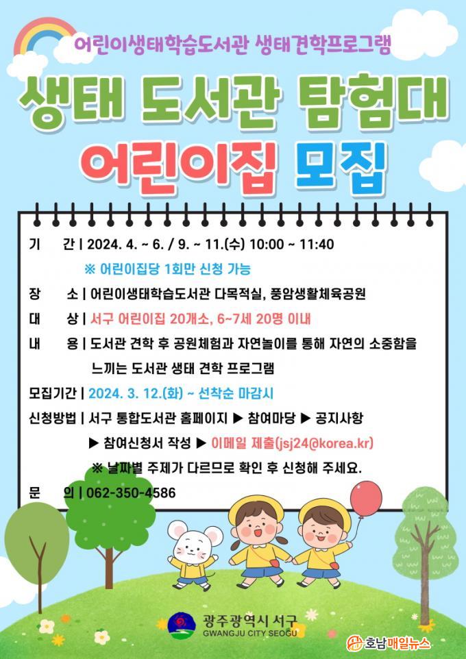 ½ÅûÀº ¼±¸ÅëÇÕµµ¼°ü ȨÆäÀÌÁö(http://www.seogu.gwangju.kr/library)¿¡¼ °ü·Ã ¼·ù¸¦ ÀÛ¼ºÇØ À̸ÞÀÏ(jsj24@korea.kr)·Î Á¦ÃâÇÏ¸é µÈ´Ù. ´Ü ¾ß¿ÜȰµ¿ÀÌ Æ÷ÇÔµÈ ÇÁ·Î±×·¥À¸·Î ÀμÖÀÚ 2¸í ÀÌ»óÀÌ µ¿¹ÝÇØ¾ß Çϸç, ÇÑ ¾î¸°ÀÌÁý´ç 1ȸ¸¸ Âü¿© °¡´ÉÇÏ´Ù.