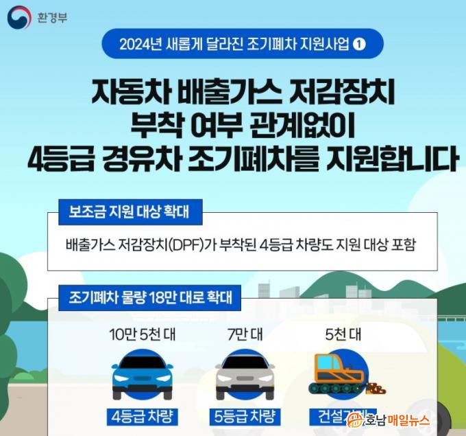 Á¶±â ÆóÂ÷ ´ë»ó Â÷·®Àº ¡ã¹èÃâ°¡½º 4¡¤5µî±Þ °æÀ¯Â÷ ¡ã2009³â 8¿ù31ÀÏ ÀÌÀü ¹èÃâÇã¿ë±âÁØÀ» Àû¿ë¹Þ°í Á¦ÀÛµÈ ´ýÇÁÆ®·°¡¤ÄÜÅ©¸®Æ®¹Í½ºÆ®·°¡¤ÄÜÅ©¸®Æ®ÆßÇÁÆ®·° µî µµ·Î¿ë °Ç¼³±â°è ¡ã2004³â 12¿ù 31ÀÏ ÀÌÀü ¹èÃâÇã¿ë±âÁØ¿¡ ¸Â°Ô Á¦ÀÛµÈ ±â°èÂ÷¡¤±¼»è±â´Ù. Á¶±â ÆóÂ÷ Áö¿ø±ÝÀº Â÷Á¾°ú ¿¬½Ä¿¡ µû¶ó º¸Çè°³¹ß¿øÀÌ »êÁ¤ÇÑ Â÷·® ±âÁؾ×ÀÇ 50~100%´Ù. ½ÅÂ÷ ±¸ÀÔ ½Ã 30~200%ÀÇ Ãß°¡ Áö¿ø±Ýµµ ¹ÞÀ» ¼ö ÀÖ´Ù.