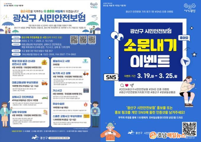 ±¤»ê±¸´Â ½Ã¹Î¾ÈÀüº¸Çè ÇýÅÃÀ» ¸¹Àº ½Ã¹Î¿¡°Ô ¾Ë¸®±â À§ÇØ 19ÀϺÎÅÍ 25ÀϱîÁö ¡®±¤»ê±¸ ½Ã¹Î¾ÈÀüº¸Çè ¼Ò¹®³»±â À̺¥Æ®¡¯µµ ÁøÇàÇÑ´Ù. ±¤»ê±¸ ½Ã¹Î¾ÈÀüº¸Çè È«º¸¹° ¶Ç´Â È«º¸ °ü·Ã ÀÎÅÍ³Ý ÁÖ¼Ò(¸µÅ©)¸¦ °³ÀÎ ´©¸®¼ÒÅë¸Á(SNS)¿¡ ¿Ã·Á ¡®À̺¥Æ® Âü¿© Å¥¾Æ¸£(QR)Äڵ塯¸¦ ÅëÇØ ÀÎÁõÇÏ¸é µÈ´Ù. À̺¥Æ® Âü¿©ÀÚ Áß Ãß÷À» ÅëÇØ ¡â»óǰ±Ç(150¸í)À» ÁõÁ¤ÇÑ´Ù.