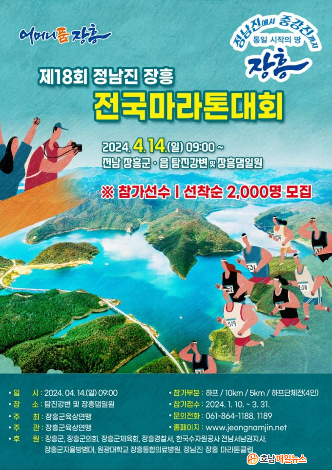ÀåÈﱺÀ°»ó¿¬¸ÍÀÌ ÁÖÃÖÇÏ´Â ¿ÃÇØ ´ëȸ´Â Âü°¡¼±¼ö 2000¸íÀ» ¼±Âø¼øÀ¸·Î ¸ðÁýÇÑ´Ù. Âü°¡½ÅûÀº ¿À´Â 3¿ù 31ÀϱîÁö ¡®Á¤³²Áø ÀåÈï Àü±¹¸¶¶óÅæ´ëȸ¡¯ ȨÆäÀÌÁö(www.jeongnamjin.net) ¶Ç´Â ÀüÈ(061-864-1188)·Î ÇÏ¸é µÈ´Ù.