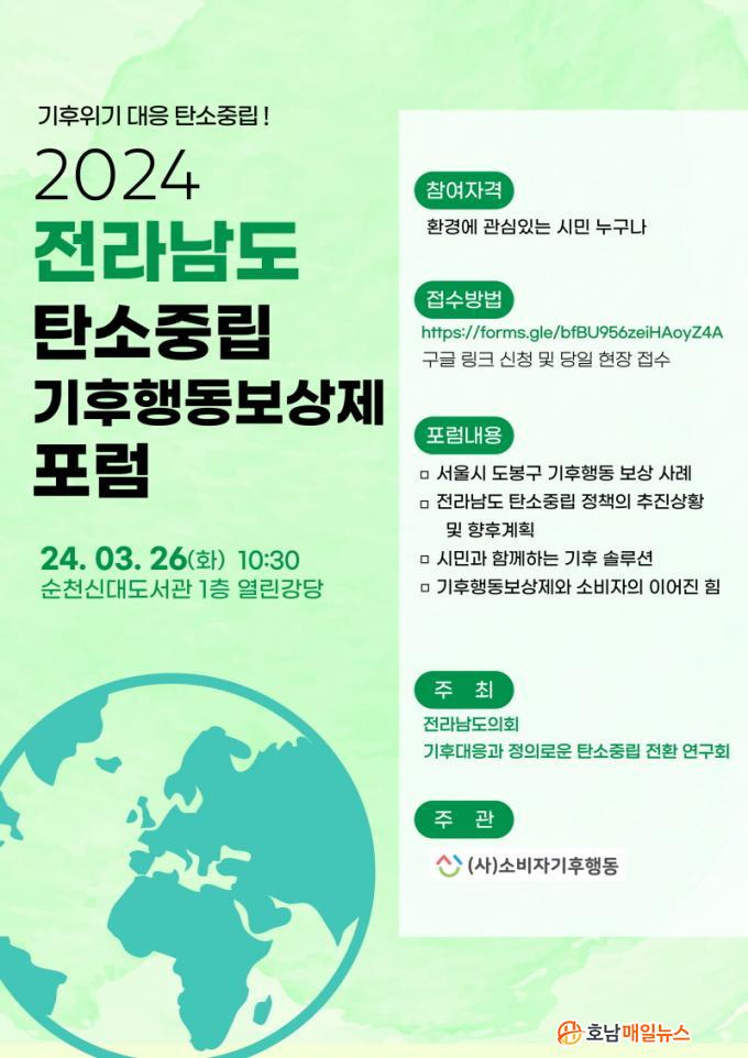 [È£³²¸ÅÀÏ´º½º] Àü³²µµÀÇȸ ¡®±âÈÄ´ëÀÀ°ú Á¤ÀǷοî ź¼ÒÁ߸³ Àüȯ ¿¬±¸È¸(´ëÇ¥À§¿ø ÁÖÁ¾¼·)¡¯°¡ ÁÖÃÖÇϰí (»ç)¼ÒºñÀÚ±âÈÄÇൿÀÌ ÁÖ°üÇÏ´Â 2024 Àü¶ó³²µµ ź¼ÒÁ߸³ ±âÈÄÇൿº¸»óÁ¦ Æ÷·³ÀÌ 3¿ù 26ÀÏ ¼øÃµ ½Å´ëµµ¼°ü ¿¸°°´ç¿¡¼ °³ÃֵȴÙ.
