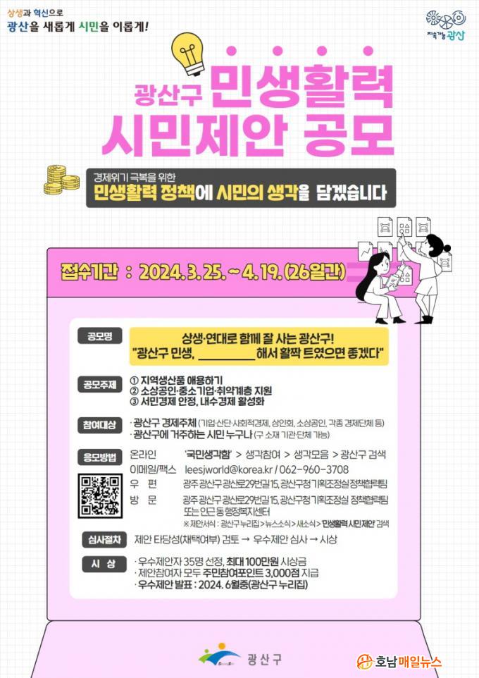 ±¤»ê±¸ ´©¸®Áý(´º½º‧¼Ò½Ä¡æ»õ¼Ò½Ä¡æ¡®¹Î»ýȰ·Â ½Ã¹Î Á¦¾È¡¯ °Ë»ö)¿¡ °Ô½ÃµÈ ½Åû ¼·ù¸¦ ³»·Á¹Þ¾Æ ÀÛ¼ºÇØ ¿Â¶óÀÎ(±¹¹Î»ý°¢ÇÔ), ÀüÀÚ¿ìÆí(leesjworld@korea.kr)¡¤ÆÑ½º(062-960-3708), ¿ìÆí‧¹æ¹®À» ÅëÇØ Á¦ÃâÇÏ¸é µÈ´Ù.