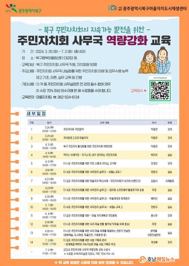 3¿ù 26ÀϺÎÅÍ 7¿ù 2ÀϱîÁö ÃÑ 14°À¸·Î ÁøÇàµÇ´Â ¡®2024 ÁÖ¹ÎÀÚġȸ »ç¹«±¹ ¿ª·® °È ±³À°¡¯Àº À̿뿬 ¸¶À»ÀÚÄ¡¿¬±¸¼ÒÀåÀ» ºñ·ÔÇÏ¿© È«¼ö¸¸ ¼ººÏ¸¶À»»ìÀÌ¿¬±¸È¸ ´ëÇ¥ µî ÇÐ°è ¹× ¸¶À» ÇöÀåÀ» ±â¹ÝÇÑ Àü¹® °»çÁø°ú °ü ³» ºÏ±¸¸¶À» Ȱµ¿°¡°¡ Á÷Á¢ °»ç·Î Âü¿©ÇÑ´Ù. ÁÖ¿ä °ÀÇ ³»¿ëÀº ¡®ÁÖ¹ÎÀÚÄ¡¿Í ÁֹΠÂü¿©ÀÇ ÀÌÇØ¡¯, ¡®´õ ½¬¿î ÁÖ¹ÎÀÚġȸ¸¦ À§ÇÑ »ç¹«°ü¸® ½Ç¹«¡¯, ¡®¿ì¸® ¸¶À» ÀÇÁ¦ ÇØ°á ÄÁ¼³ÆÃ °úÁ¤¡¯ µî ´Ù¾çÇÑ ÇÁ·Î±×·¥À¸·Î ±¸¼ºµÇ¾ú´Ù.
