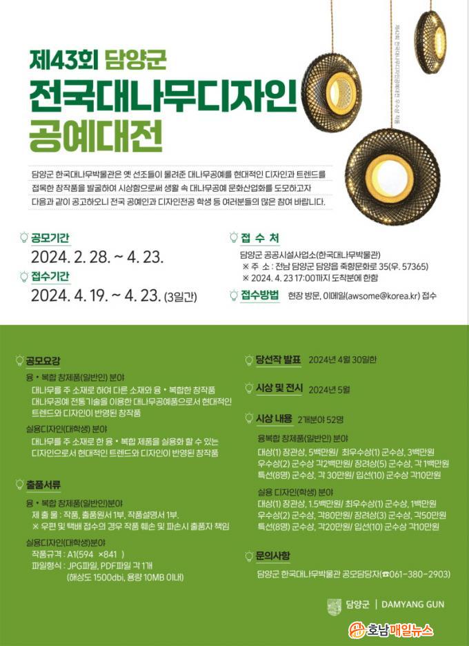 ¿¾ ¼±Á¶ºÎÅÍ À̾î¿Â ´ë³ª¹«°ø¿¹¿¡ Çö´ëÀûÀÎ µðÀÚÀΰú »ç¿ë¼ºÀ» Á¢¸ñÇÑ Ã¢ÀÛǰÀ» ¹ß±¼Çϱâ À§ÇØ °³ÃÖÇÏ´Â Àü±¹ ´ë³ª¹«µðÀÚÀΰø¿¹´ëÀüÀº ´ë³ª¹« À¶¡¤º¹ÇÕÁ¦Ç°°ú ½Ç¿ëµðÀÚÀÎ 2°³ ºÐ¾ß·Î °ü±¤±â³äǰ, »ýȰ¼Òǰ, »ç¹«¿ëǰ µîÀ» Ãâǰ ´ë»óÀ¸·Î ÇÑ´Ù.