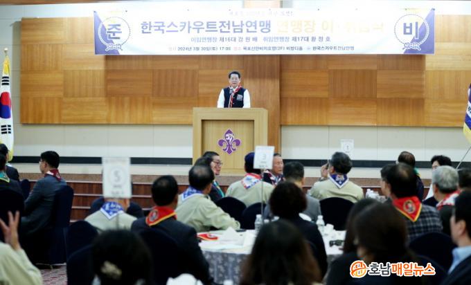ÀÌ¡¤ÃëÀӽĿ¡´Â ±è¿µ·Ï Àü³²µµÁö»ç, ±è´ëÁß Àü³²µµ±³À°°¨, ±è¿øÀÌ ±¹È¸ÀÇ¿ø, Á¶°æ½Ä Çѱ¹½ºÄ«¿ìÆ®¿¬¸Í »ç¹«ÃÑÀå°ú Àü³²¿¬¸Í ÀÓ¿ø ¹× ´ë¿ø µî 150¿© ¸íÀÌ Âü¼®ÇØ ½ÅÀÓ È²Á¤È£ ¿¬¸ÍÀåÀÇ ÃëÀÓÀ» ÃàÇÏÇϰí ÀÌÀÓÇÏ´Â °¿ø¹è ¿¬¸ÍÀåÀÇ ³ë°í¸¦ °Ý·ÁÇß´Ù.