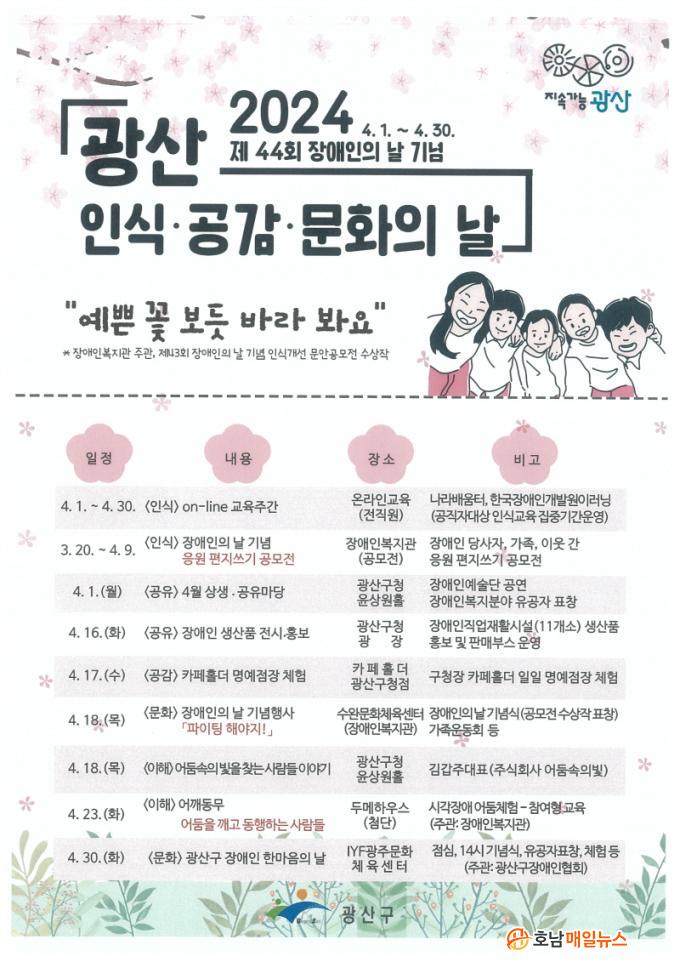 ±¤»ê±¸ °ü°èÀÚ´Â ¡°4¿ù ÇÑ ´Þ°£ ±¤»ê±¸ °÷°÷¿¡¼ Àå¾ÖÀνÄÀ» »õ·Ó°Ô Çϱâ À§ÇÑ °ø°¨°ú üÇèȰµ¿ ±×¸®°í Áֹεé°ú ÇÔ²² °øÀ¯ÇÏ´Â °øµ¿Ã¼ Ȱµ¿À» ´Ù¾çÇÏ°Ô ÆîÄ¥ ¿¹Á¤ÀÌ´Ù¡±¸ç ¡°Àå¾ÖÀΰú ºñÀå¾ÖÀÎ ¸ðµÎ Çϳª µÇ´Â ÇູÇÑ ±¤»êÀ» ÇâÇØ ³ª¾Æ°¡´Â ÀÇ¹Ì ÀÖ´Â ½Ã°£ÀÌ µÉ °ÍÀ¸·Î ±â´ëÇÑ´Ù¡±°í ¸»Çß´Ù.
