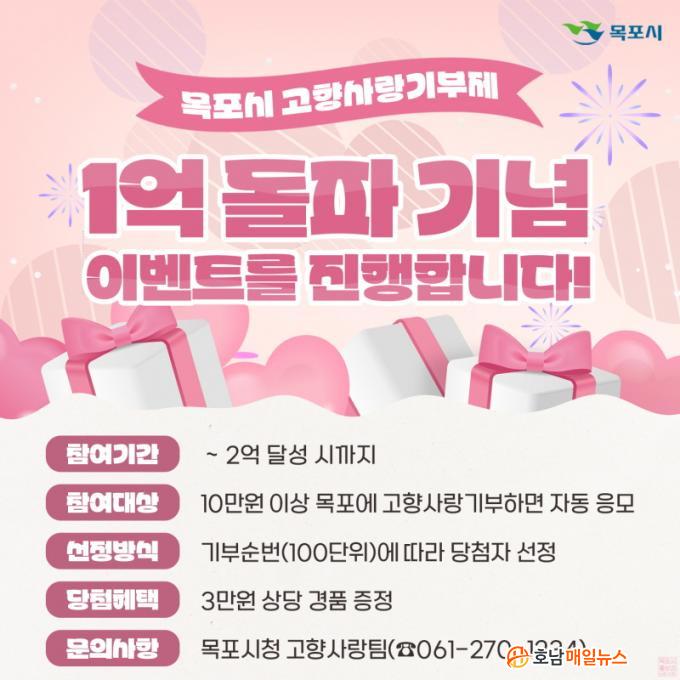 À̺¥Æ®´Â ¸ñÆ÷ °íÇâ»ç¶û±âºÎ ¸ð±Ý¾× 2¾ï¿ø ´Þ¼º±îÁö ÁøÇàµÇ¸ç ´ç÷ÀÚ°¡ º»ÀÎ SNS¿¡ ±âºÎ ÀÎÁõ½Ã 3¸¸¿ø »ó´çÀÇ °æÇ°ÀÌ Áö±ÞµÈ´Ù.
