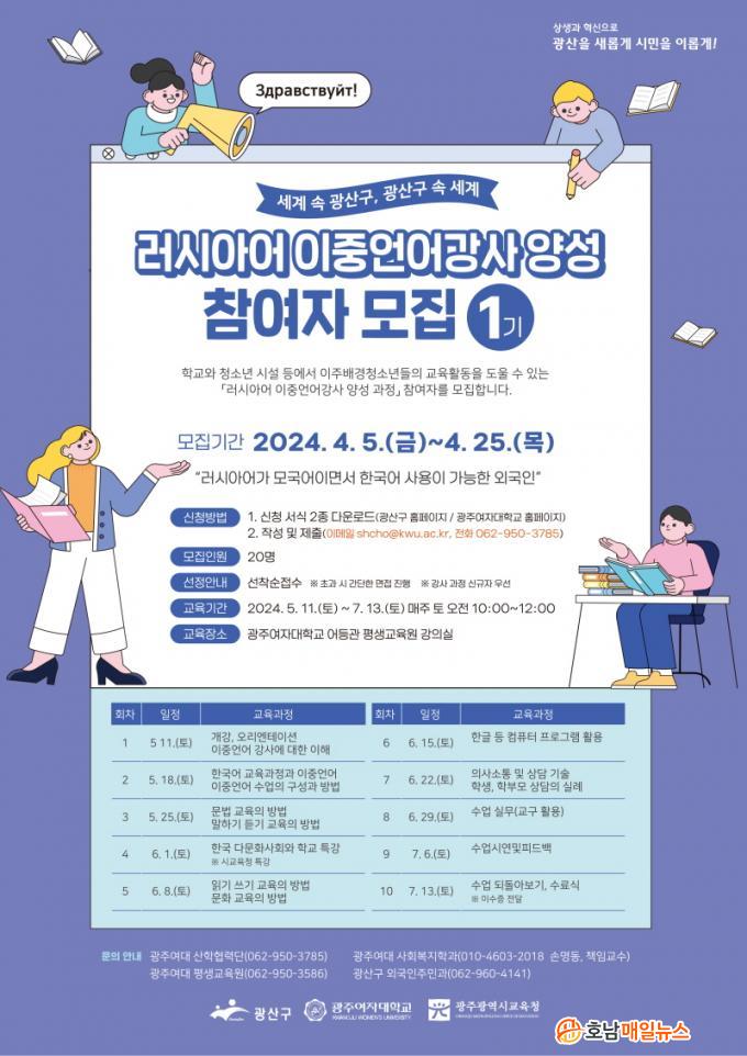 °úÁ¤Àº 5¿ù 11ÀϺÎÅÍ 2°³¿ù°£ ¸ÅÁÖ Åä¿äÀÏ ¿ÀÀü ±¤ÁÖ¿©´ë¿¡¼ ¿î¿µÇÑ´Ù. ¸ðµç °úÁ¤À» ¼ö·áÇÑ ¿Ü±¹ÀÎ ÁÖ¹ÎÀº ±³À°Ã» ¹× ÀÌÁÖ¹è°æ û¼Ò³âÀ» À§ÇÑ Çѱ¹¾î ÇбÞÀÌ °³¼³µÈ Çб³¿¡ ÀÌÁß¾ð¾î°»ç·Î ÃßõµÈ´Ù. °»ç·Î ä¿ëµÇ¸é ¾ð¾îÀÇ ÇѰè·Î Çб³»ýȰ¿¡ ¾î·Á¿òÀÌ ÀÖ´Â ·¯½Ã¾Æ¾î±Ç Çлýµé°ú Çѱ¹ÀÎ ±³»ç »çÀÌ¿¡¼ ¼ÒÅë ⱸ ¿ªÇÒÀ» ÇÑ´Ù.