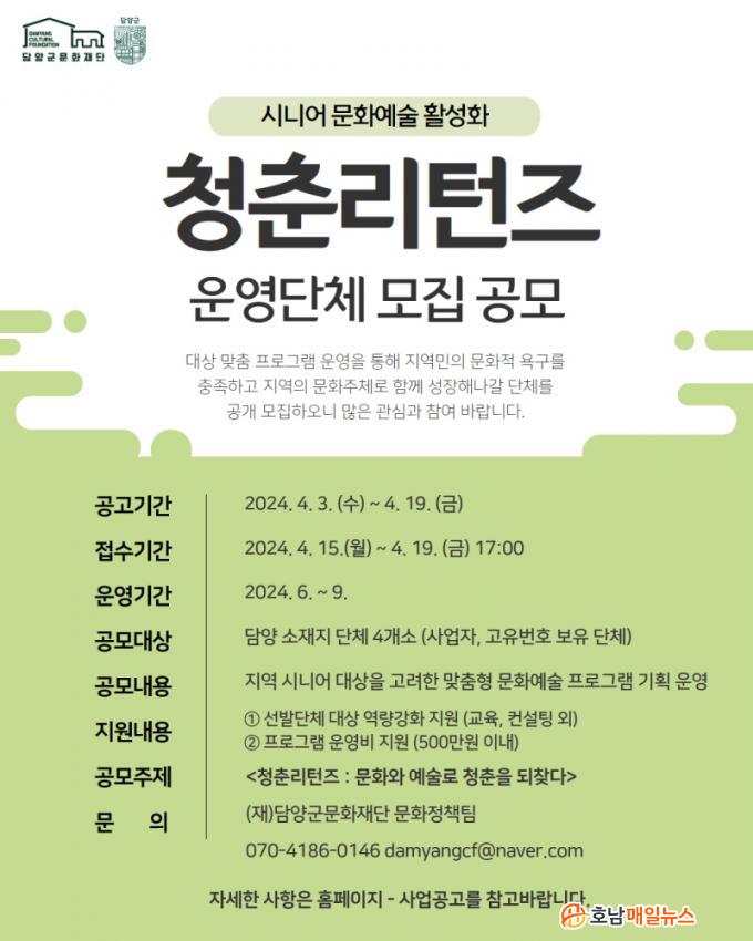 ÀÚ¼¼ÇÑ »çÇ×Àº (Àç)´ã¾ç±º¹®ÈÀç´Ü ȨÆäÀÌÁö(damyangcf.or.kr) ³» »ç¾÷°ø°í¸¦ Âü°íÇϰųª, ¹®ÈÁ¤Ã¥ÆÀ(070-4493-3481)À¸·Î ¹®ÀÇÇÏ¸é µÈ´Ù.