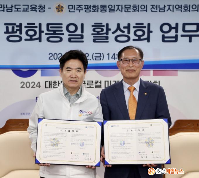 [»çÁø¼³¸í] ±è´ëÁß Àü³²±³À°°¨(¿ÞÂÊ)°ú ¿ì½ÂÇÏ ¹ÎÁÖÆòÈÅëÀÏÀÚ¹®È¸ÀÇ Àü³²Áö¿ªÈ¸ÀÇ ºÎÀÇÀåÀÌ 12ÀÏ Àü³²±³À°Ã» ºñÁî´Ï½º½Ç¿¡¼ ¿¸° ¾÷¹«Çù¾à½ÄÀ» ¸¶Ä£ µÚ ±â³äÃÔ¿µÀ» Çϰí ÀÖ´Ù.