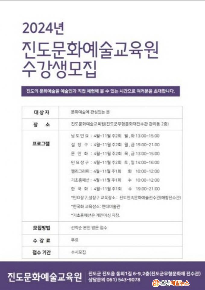 ±³À°Àº ¿À´Â 11¿ù±îÁö ÁÖ1~2ȸ, 2½Ã°£¾¿ Áøµµ±º ¹«Çü¹®È­Àç Àü¼ö°ü 2Ãþ Áøµµ¹®È­¿¹¼ú±³À°¿ø µî¿¡¼­ ÁøÇàÇÑ´Ù. ¼ö°­·á´Â ¹«·áÀÌ¸ç ½ÅûÀº º»ÀÎÀÌ Áøµµ¹®È­¿¹¼ú±³À°¿ø¿¡ ¹æ¹® Á¢¼öÇÏ°í ¼±Âø¼ø Á¶±â ¸¶°¨µÉ ¼ö ÀÖ´Ù.