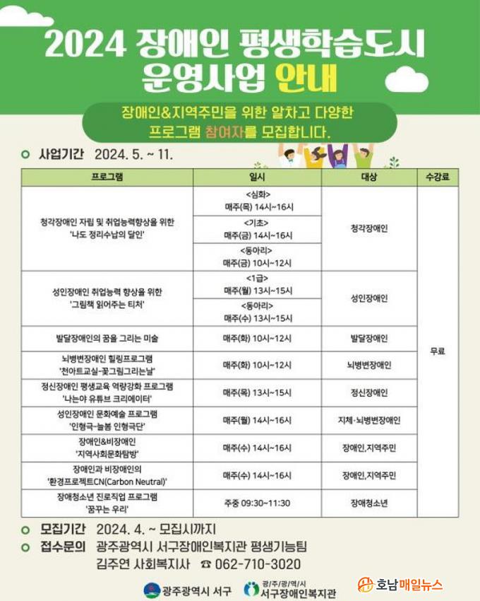 ¿ÃÇØ ÁøÇàµÇ´Â Àå¾ÖÀÎ Æò»ýÇнÀ ÇÁ·Î±×·¥Àº û°¢Àå¾ÖÀÎ ´ë»ó ¡®³ªµµ Á¤¸®¼ö³³ÀÇ ´ÞÀΡ¯, Á¤½ÅÀå¾ÖÀÎ ´ë»ó ¡®³ª´Â¾ß À¯Æ©ºê Å©¸®¿¡ÀÌÅÍ¡¯, ¼ºÀÎÀå¾ÖÀΰú ºñÀå¾ÖÀÎÀÌ ÇÔ²² Âü¿©ÇÏ´Â ¡®È¯°æÇÁ·ÎÁ§Æ® CN¡¯µî ÃÑ 9°³ÀÇ Àå¾ÖÀ¯Çüº° ¸ÂÃãÇü ÇÁ·Î±×·¥ÀÌ ¿î¿µµÈ´Ù.
