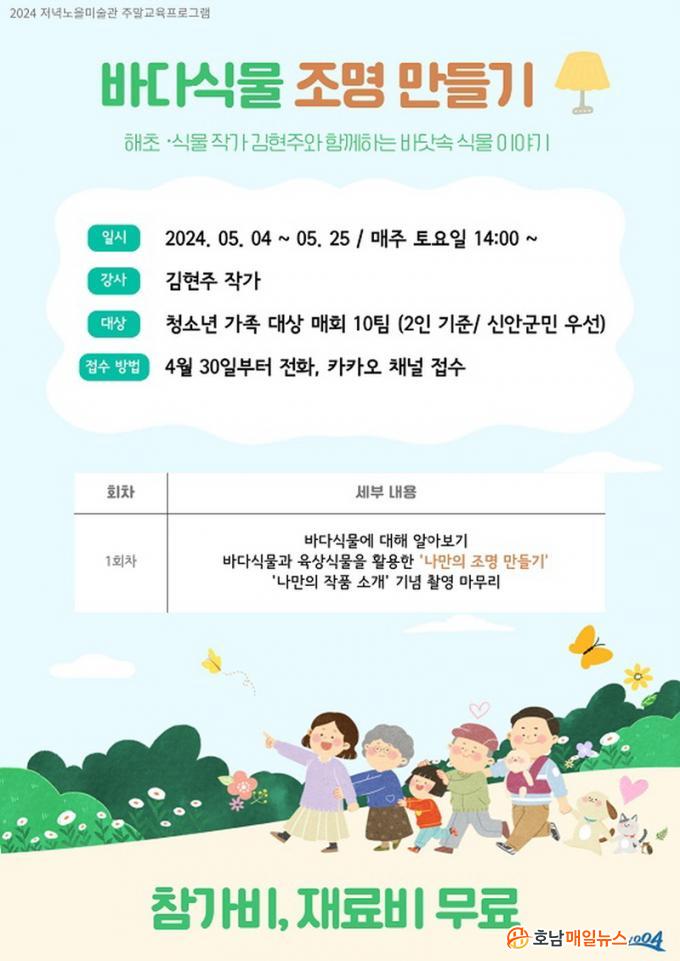 À̹ø ÇÁ·Î±×·¥Àº ÁÖ¸»¿¡ ÀÌ·ç¾îÁö´Â ±³À°À¸·Î ¿À´Â 5¿ù 4ÀÏ(Åä)ºÎÅÍ 26ÀÏ(Åä)±îÁö ¸ÅÁÖ Åä¿äÀÏ 14½ÃºÎÅÍ ÁøÇàÇϸç, Âü°¡ºñ´Â ¹«·á·Î ¸Åȸ û¼Ò³â °¡Á· 10ÆÀÀ» ¸ðÁýÇÑ´Ù. ÁÖ¿ä ³»¿ëÀ¸·Î ¹Ù´Ù½Ä¹°¿¡ ´ëÇØ ¾Ë¾Æº¸°í ¹Ù´Ù½Ä¹°°ú À°»ó½Ä¹°À» Ȱ¿ëÇÏ¿© ¡®³ª¸¸ÀÇ Á¶¸í ¸¸µé±â¡¯°¡ ¿î¿µµÈ´Ù.