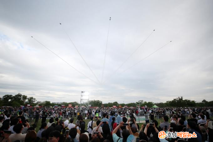 Ưº°À̺¥Æ®·Î ¸¶·ÃÇÑ ´ëÇѹα¹ °ø±º Ư¼öºñÇàÆÀ ¡®ºí·¢À̱۽º¡¯ÀÇ ¿¡¾î¼î´Â À̹ø ÃàÁ¦ ¶Ç ÇϳªÀÇ ¡®ÇÏÀ̶óÀÌÆ®¡¯¿´´Ù. ±¹»ê ÃÊÀ½¼Ó Ç×°ø±â T-50B 8´ë·Î ±¸¼ºµÈ ºí·¢À̱۽º°¡ °íµµÀÇ °á¼Ó·ÂÀ» ¹ÙÅÁÀ¸·Î È·ÁÇϰí Çö¶õÇÑ Æ¯¼öºñÇàÀ» ¼±º¸ÀÎ 15ºÐ°£ ÇöÀåÀÇ ¸ðµÎ°¡ Çϴÿ¡ ½Ã¼±À» °íÁ¤ÇÑ Ã¤ ´«À» ¶¼Áö ¸øÇß´Ù. À§Ç³´ç´çÇÑ ±âµ¿°ú ³î¶ó¿î °î¿¹¿¡ °¨Åº°ú ź¼ºÀÌ °è¼ÓµÈ °¡¿îµ¥, ºí·¢À̱۽º°¡ ±¤»ê Çϴÿ¡ űر⸦ ±×¸° ¼ø°£¿¡´Â Å« ȯȣ¿Í ¹Ú¼ö°¡ ½ñ¾ÆÁ³´Ù.